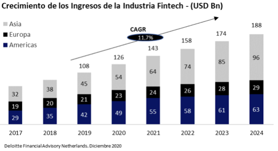 A nivel global, de acuerdo a un estudio de Deloitte Financial Advisory, los ingresos de la industria Fintech han estado creciendo a una tasa de 11,7% anual en los últimos años. En el año 2018, dichos ingresos alcanzaban USD 92.000 millones y se estima que esta cifra ascienda a USD 188.000 millones para el año 2024.
